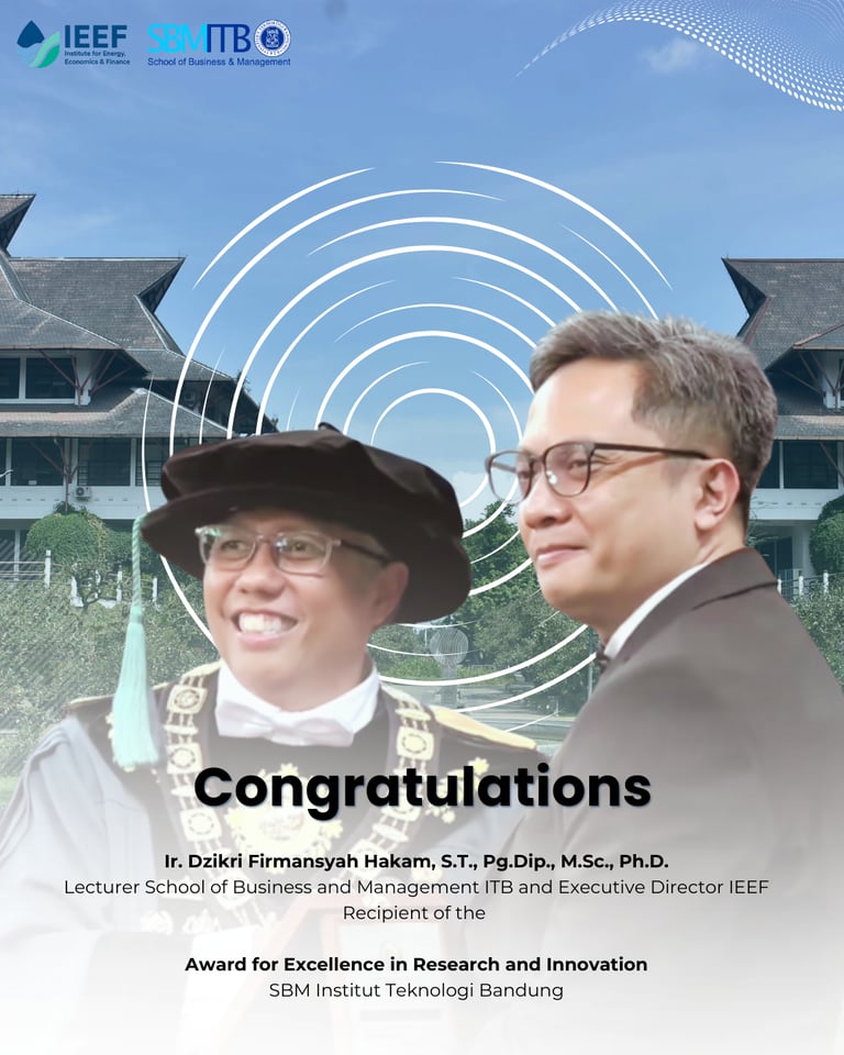 On this occasion, Ir. Dzikri Firmansyah Hakam, S.T., Pg.Dip., M.Sc., Ph.D., Lecturer at the School of Business and Management (SBM ITB) and Executive Director of the Institute for Energy, Economics & Finance (IEEF), received the Award for Excellence in Research and Innovation. The recognition was based on sustained contributions published in Scopus-indexed Q1 and Q2 international journals during the 2018–2025 evaluation period.